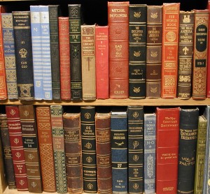 I do collect older encyclopedias, typically pre 1970 editions with ornate spines that do not have large titles on their spines. Here are some examples of what I like. If you have such a set I would need to see a snapshot of the spines to know if I can use them. I’ll pay the shipping to get the right set, but I warn you, I have to be fussy about what I collect.